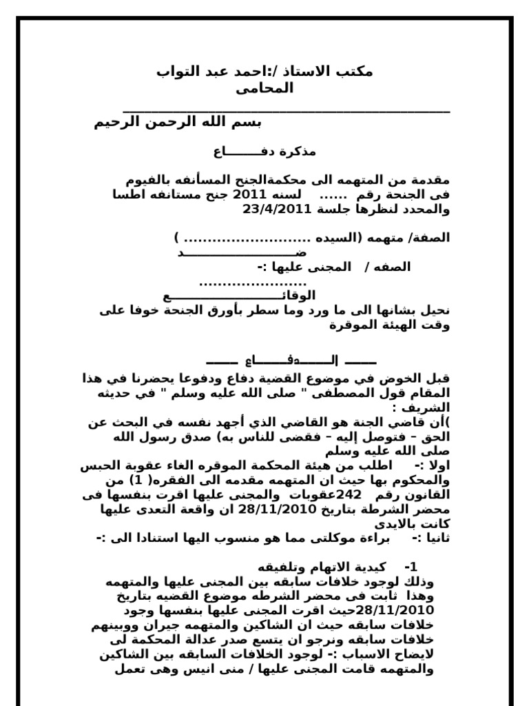 مذكرة دفاع في جنحة ضرب جروح قطعية الوليد للمحاماه والاستشارات القانونية Advocate Alwalid Lawer Facebook