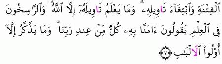 ه و ال ذ ي أ ن ز ل ع ل ي ك ال ك ت اب م ن ه آي ات م ح ك م ات ه ن أ م ال ك ت اب و أ خ ر م ت ش اب ه ات ف أ م ا ال ذ ين ف ي ق ل وب ه م ز ي غ ف ي ت ب ع ون م ا ت ش اب ه م ن ه اب ت غ اء ال ف ت ن ة و اب ت غ اء ت أ و يل ه و م ا